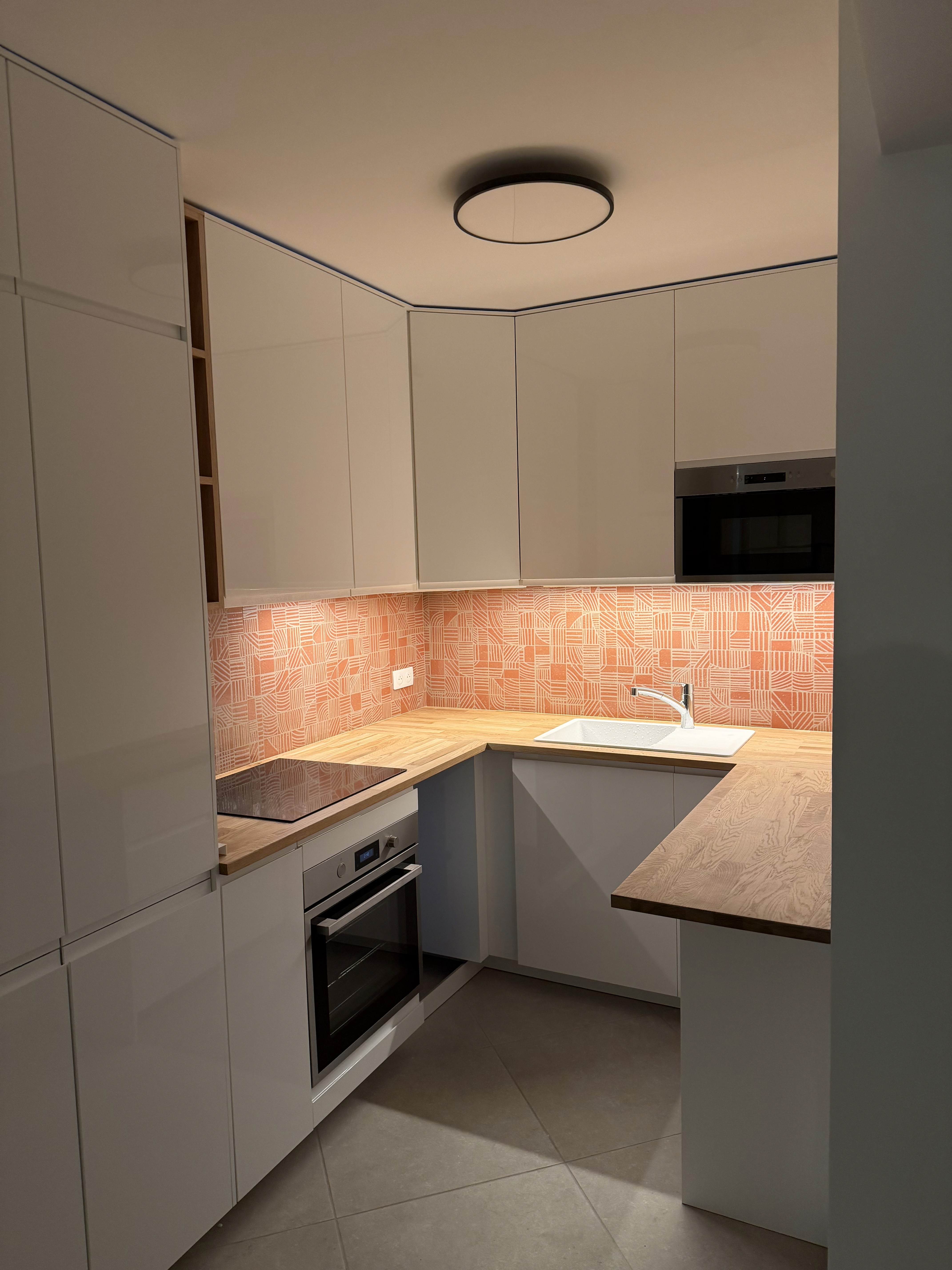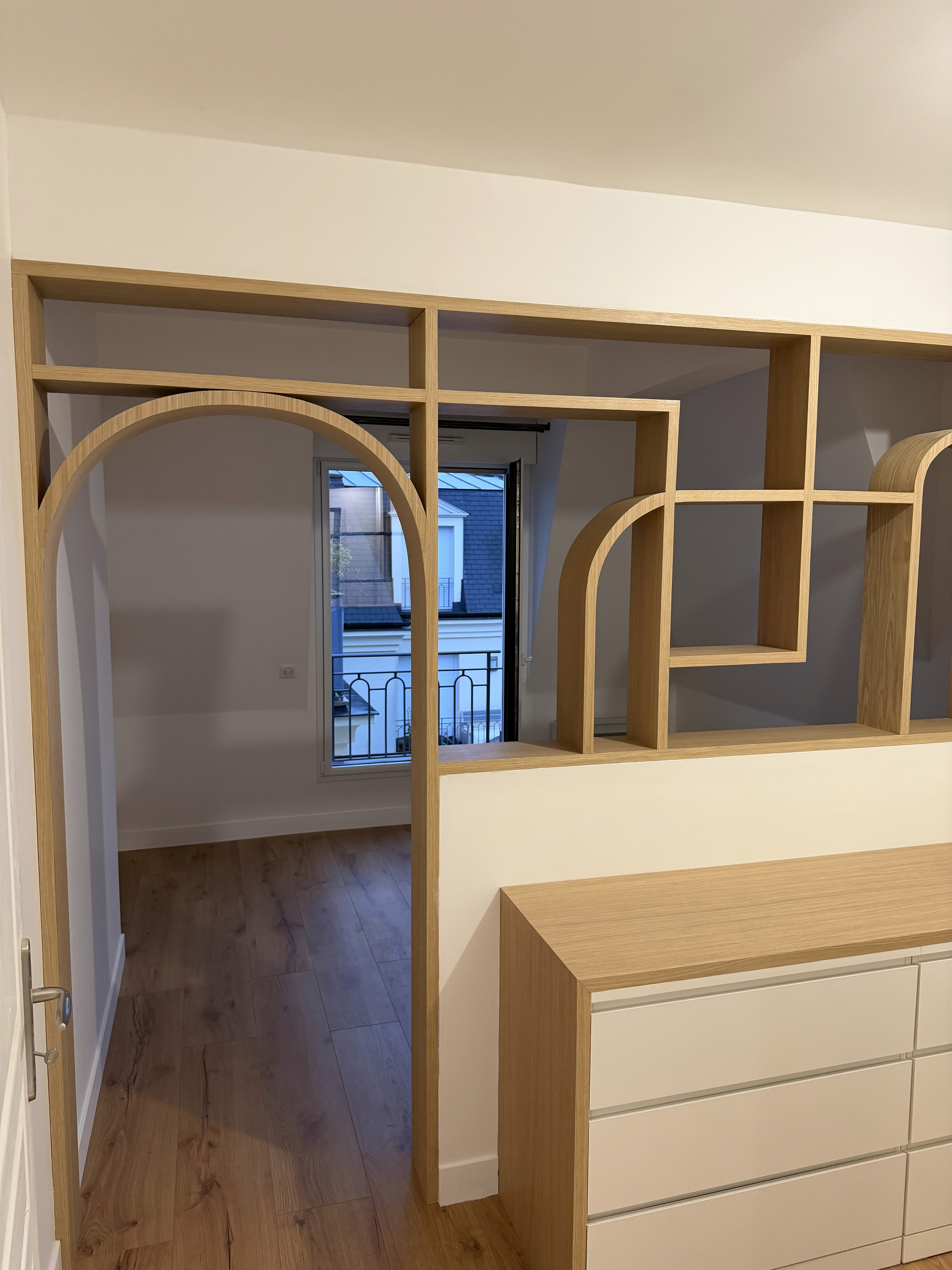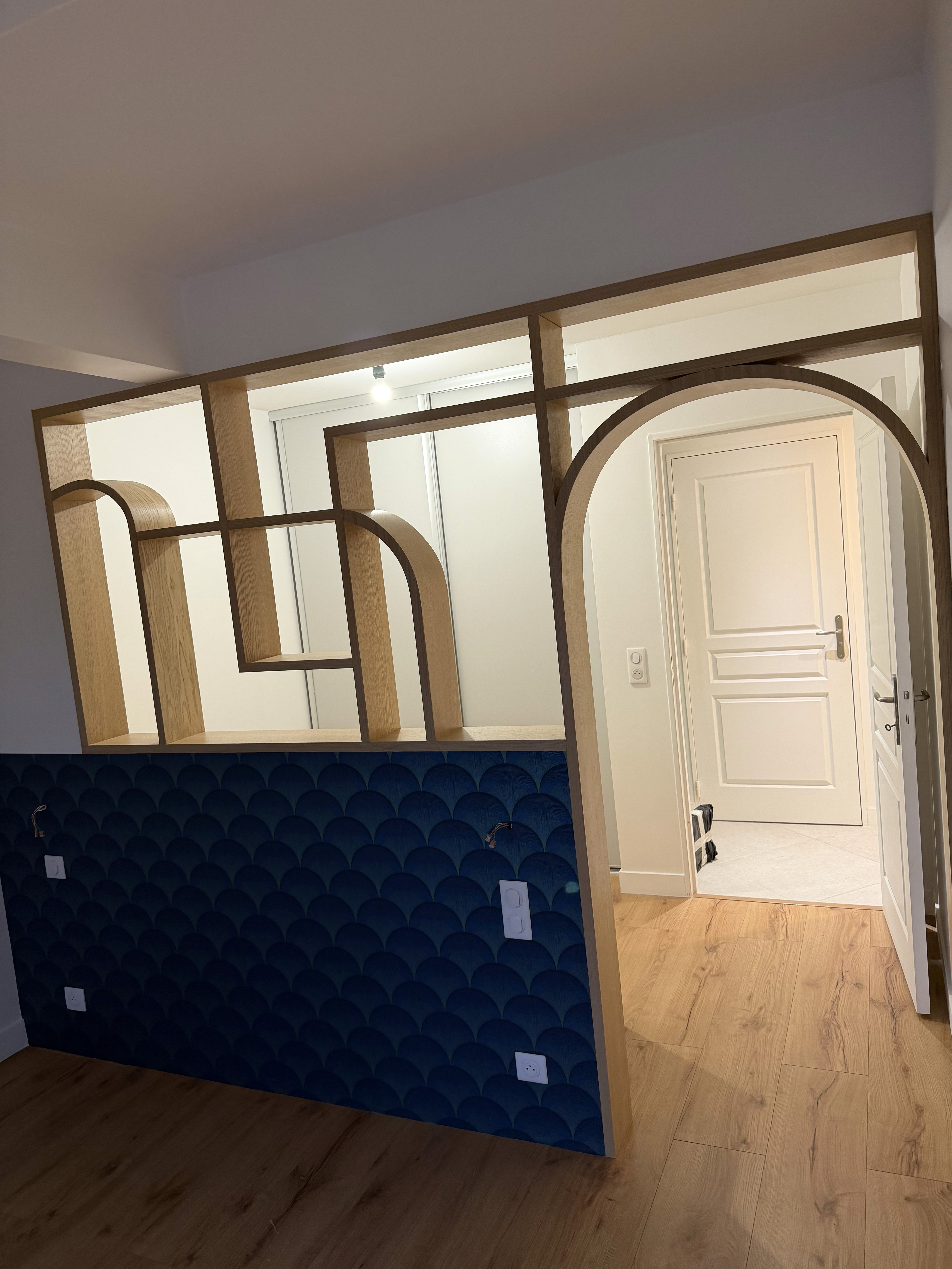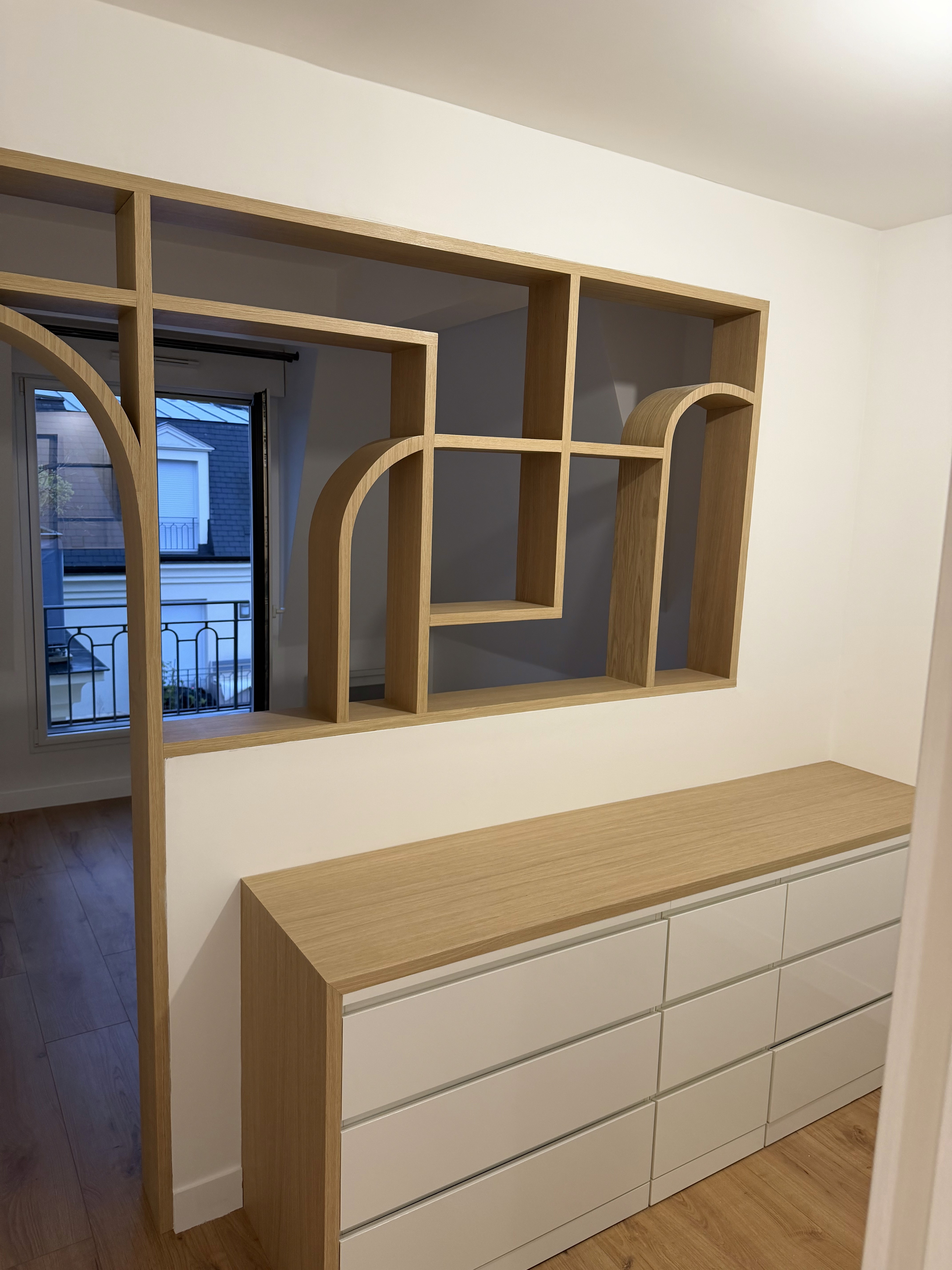 L’espace de vie a été structuré par un ensemble d’agencements sur mesure, conçu comme un système architectural à part entière. Bibliothèque, claustras et intégrations lumineuses rythment les volumes tout en conservant une grande légèreté visuelle. Le projet se distingue par la précision des détails et l’harmonie des matériaux.